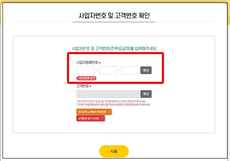 확인을 누르면 사업자등록번호와 고객번호 입력하라고 나옵니다.