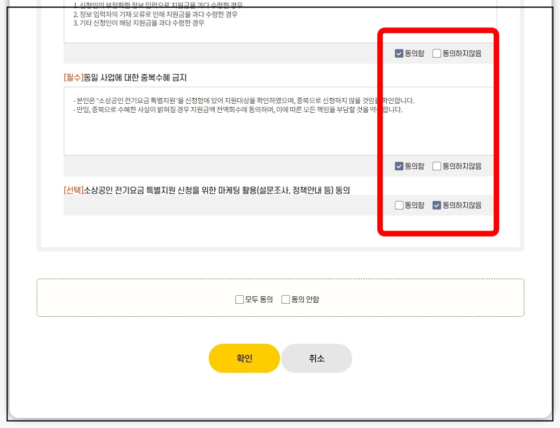 4. 전기요금 특별지원 신청자 자가진단에서 전부 "예"에 체크하시고,