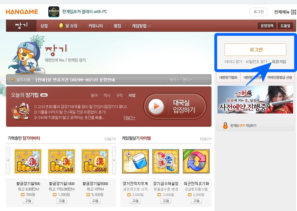 1. 장기게임을 무료로 설치(다운로드)하는 방법은 한게임 장기 홈페이지에 접속합니다.