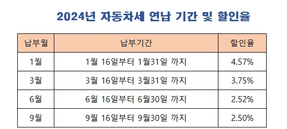 자동차를 소유하고 계신 분들은 무조건 내야 하는 자동차세 미리 1월에 선납하고 할인받아서 조금이라도 절약하시기 바랍니다. 정기납부 기한 내 납부가 안 되면 오히려 가산세 3%가 있기에 미리 납부하시고 할인 혜택을 이용하시면 좋겠습니다.