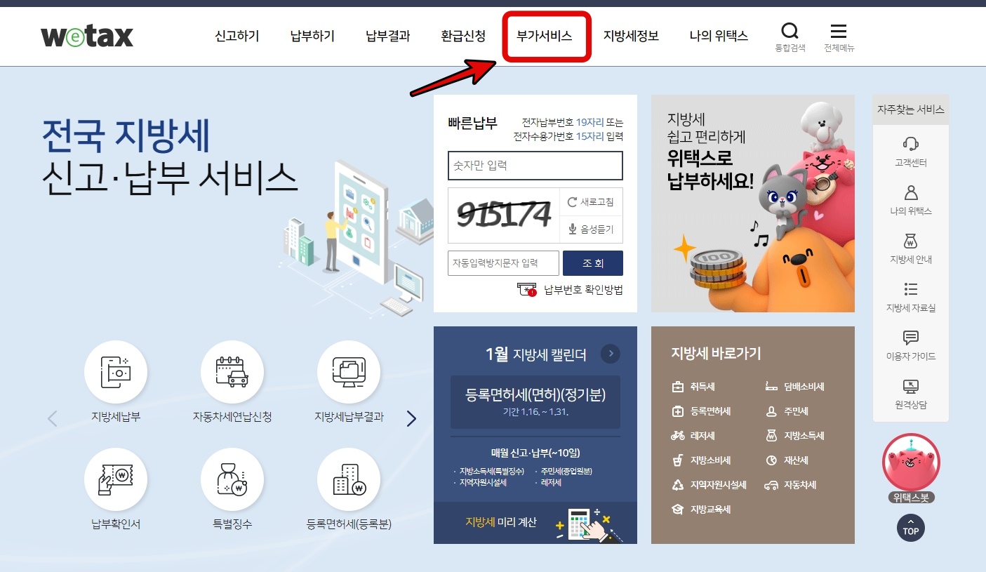 위택스 홈페이지에 접속하시고 상단의 부가서비스 메뉴에서 자동차세연납신청을 클릭하시면 됩니다. 간단하게 차량정보를 입력 후 결제 금액확인 후 결제를 진행하시기 바랍니다.